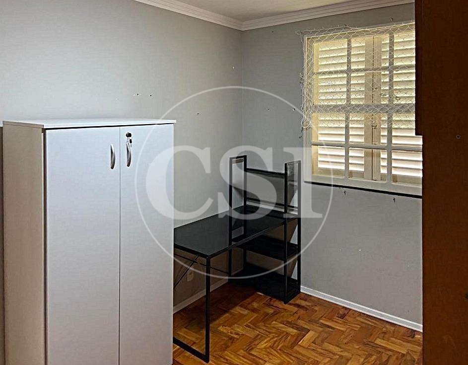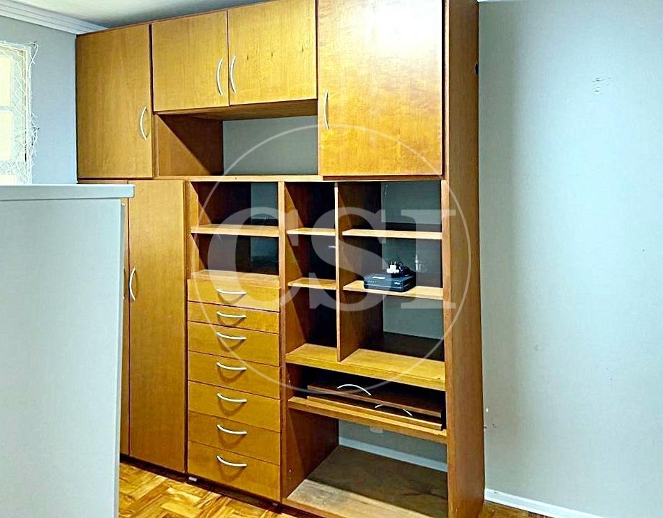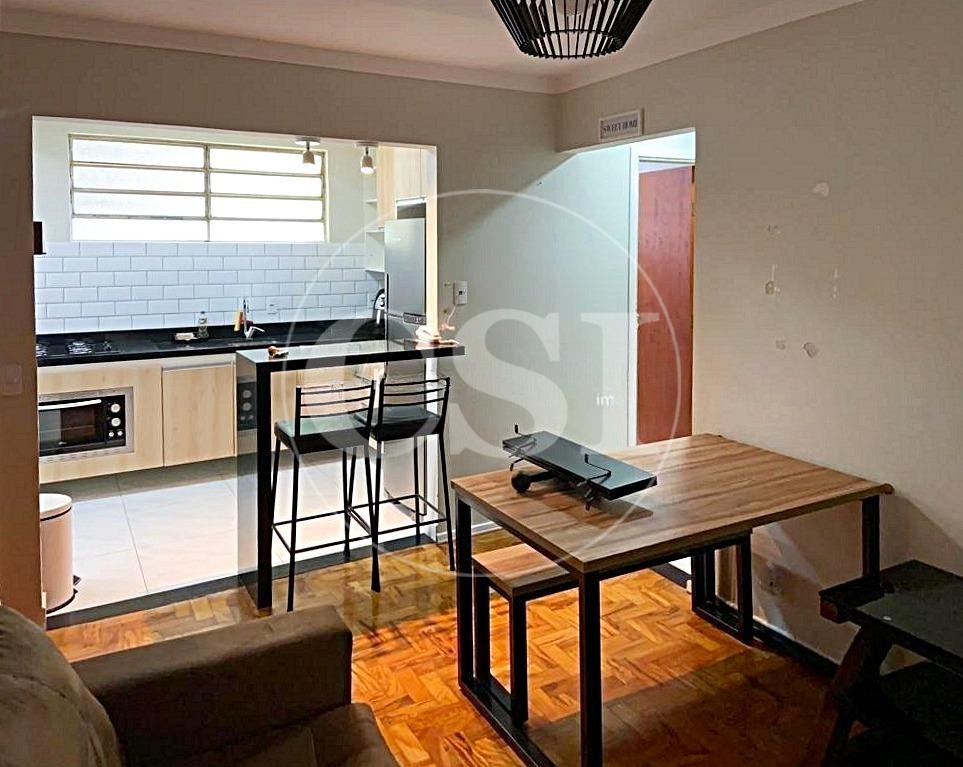 Sala integrada à cozinha por bancada em granito, proporcionando praticidade e bom gosto. Dois dormitórios e sala com piso de taco de madeira lixado e tratado.