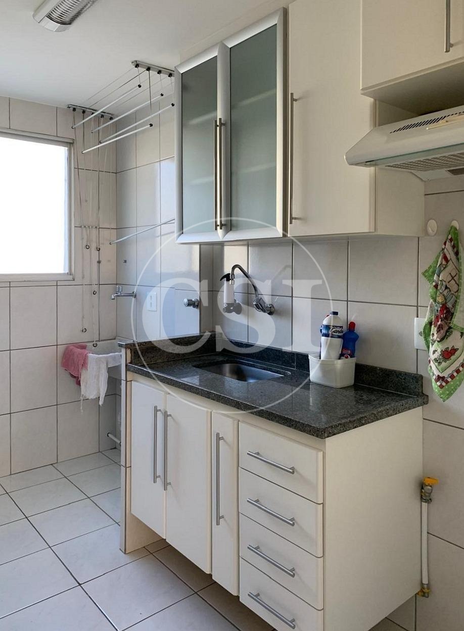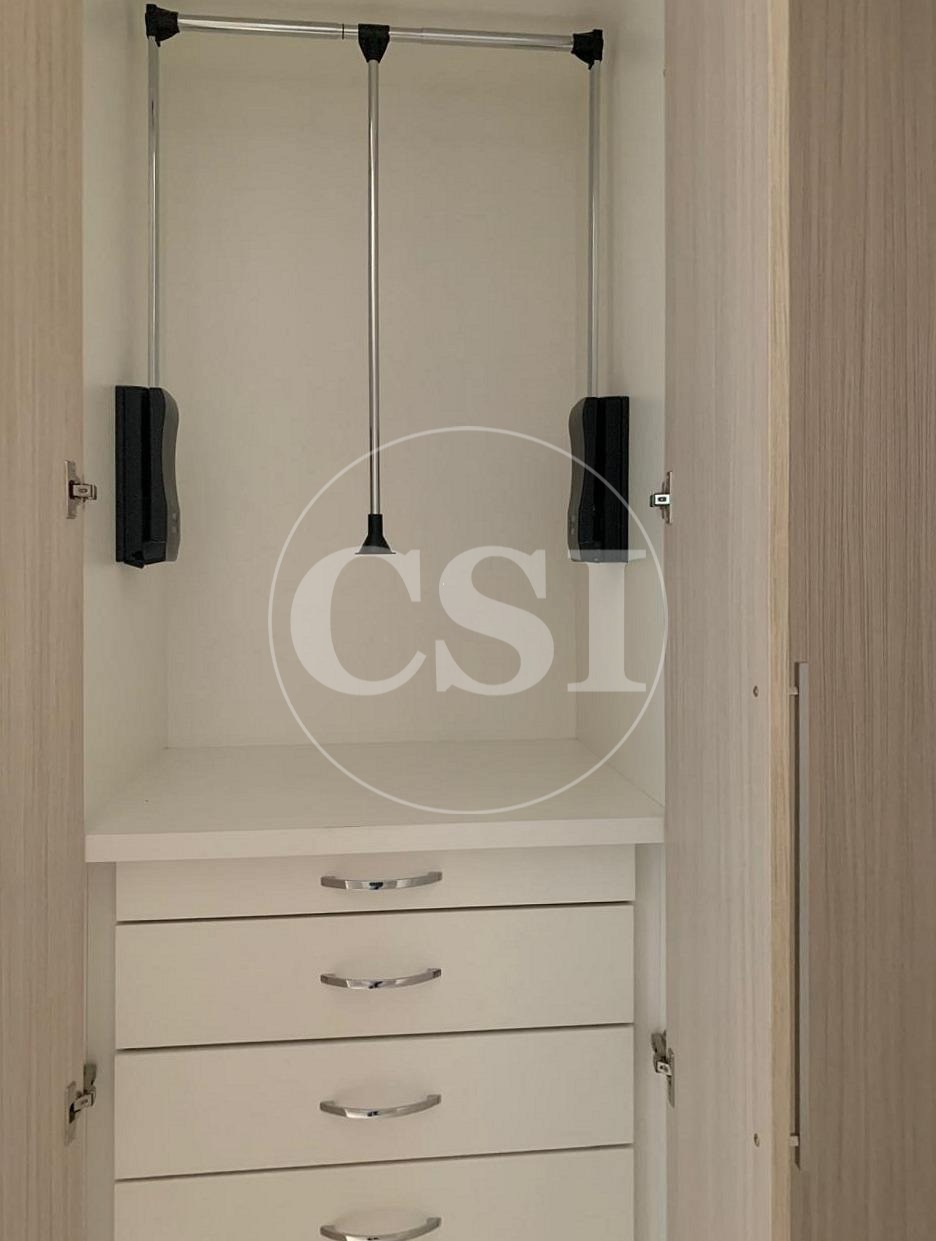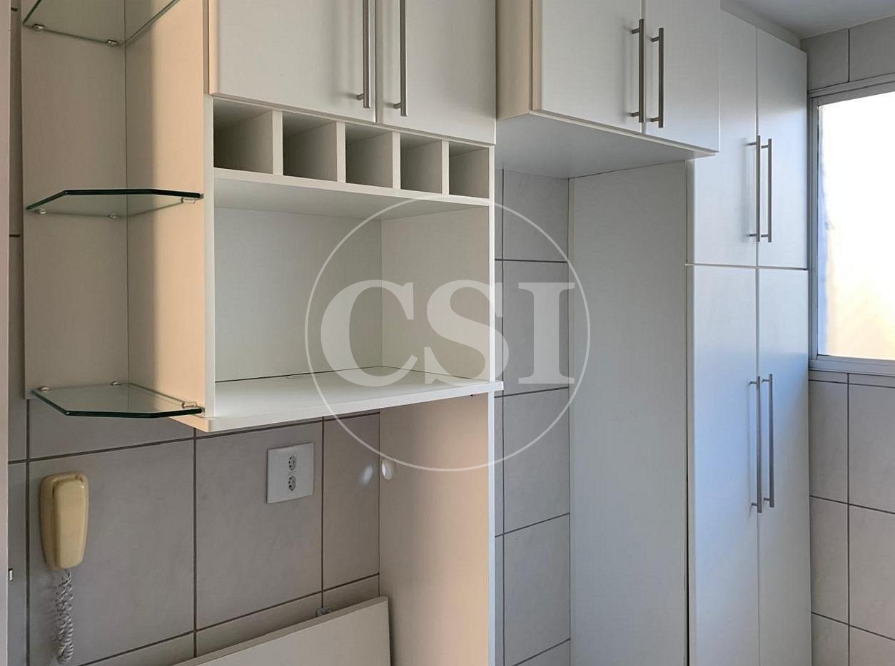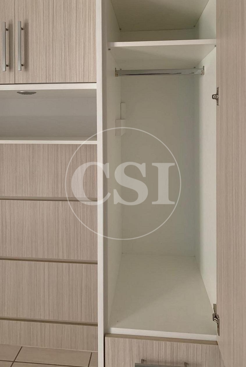 Armários planejados, sala 2 ambientes, cozinha, área de serviço e banheiros com gabinetes.