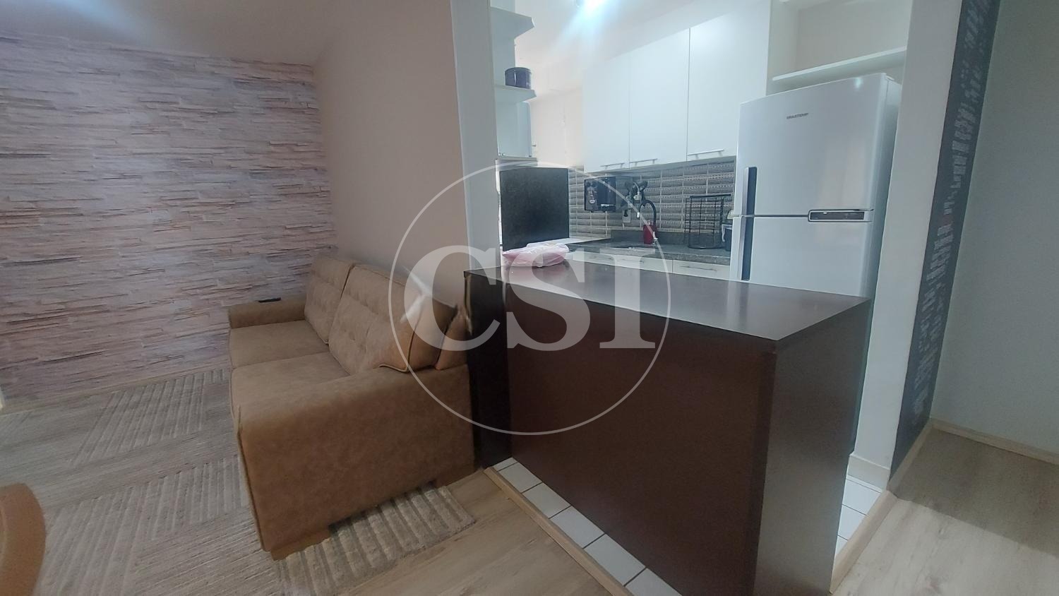 Sala ampla com 02 ambientes e bancada em madeira