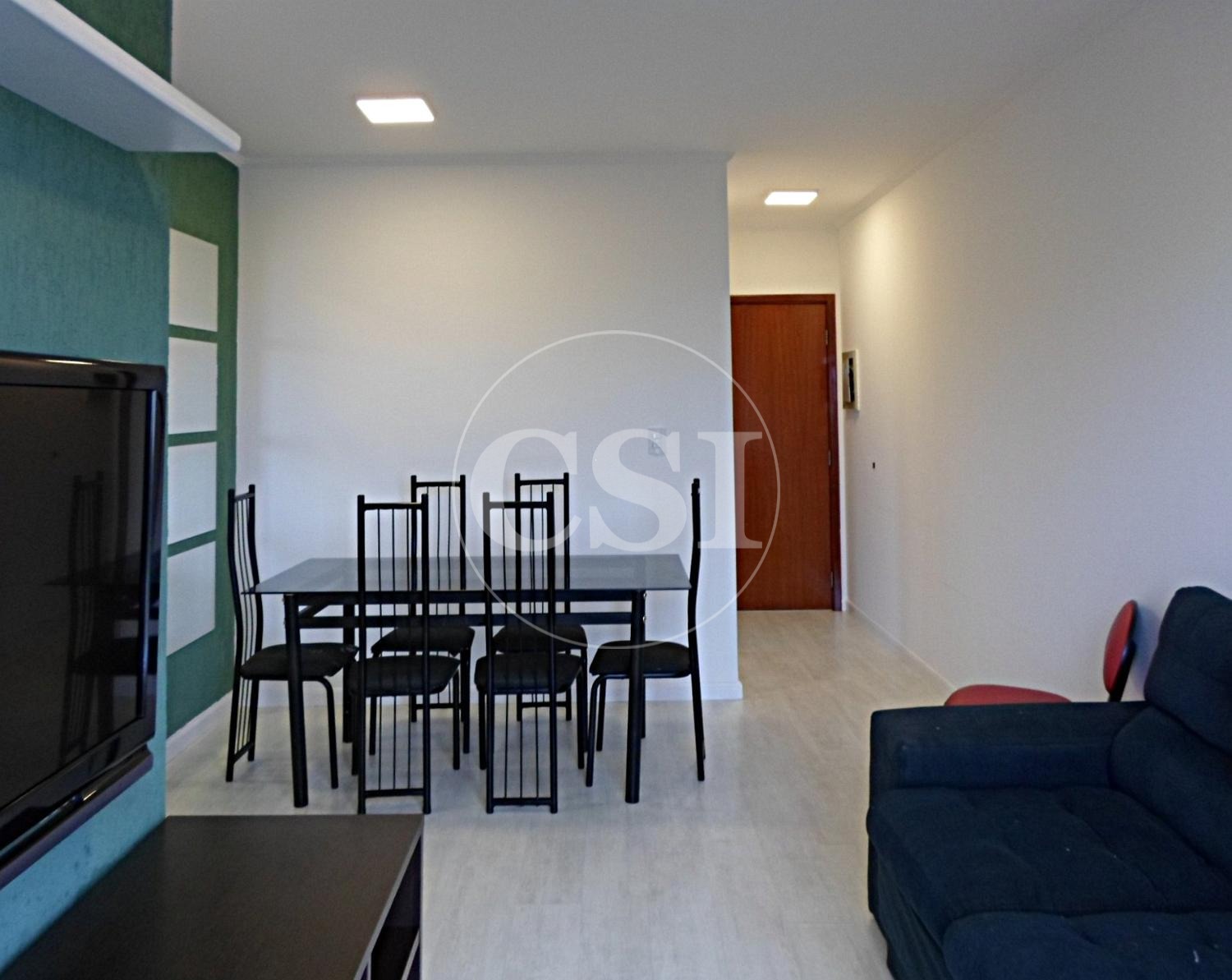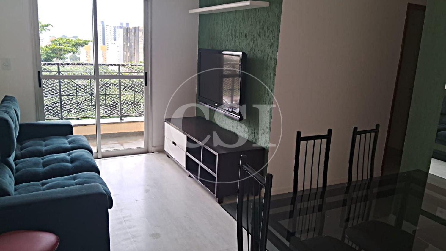 Sala para 2 ambientes, com sofá, TV e mesa de jantar