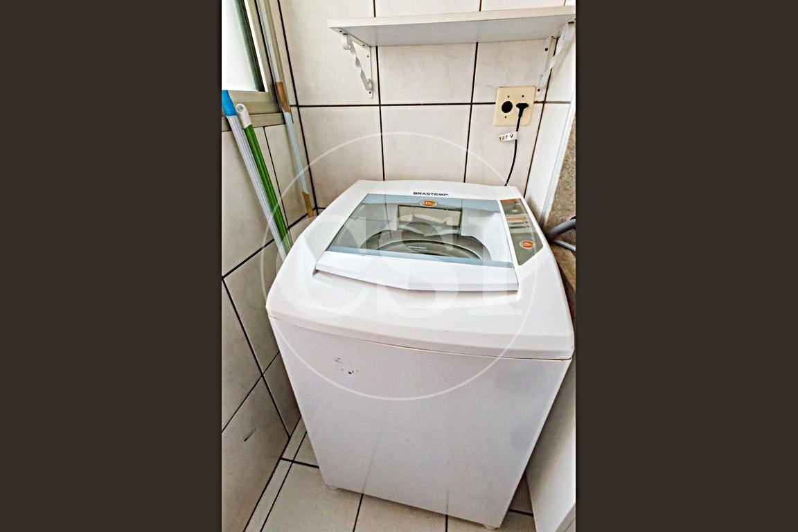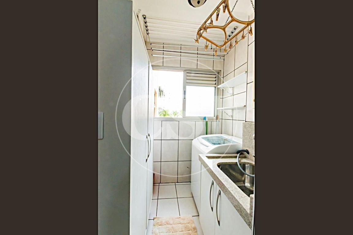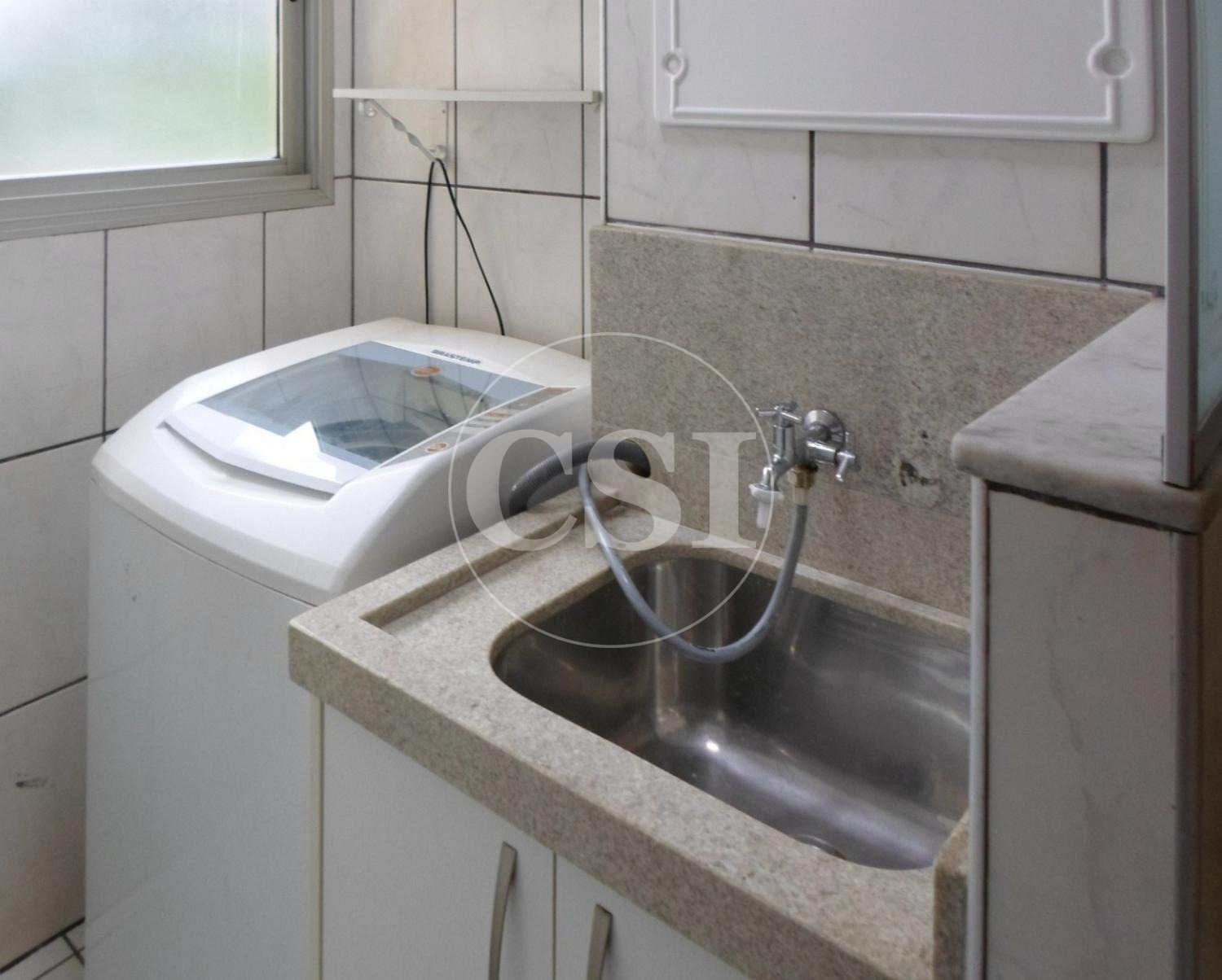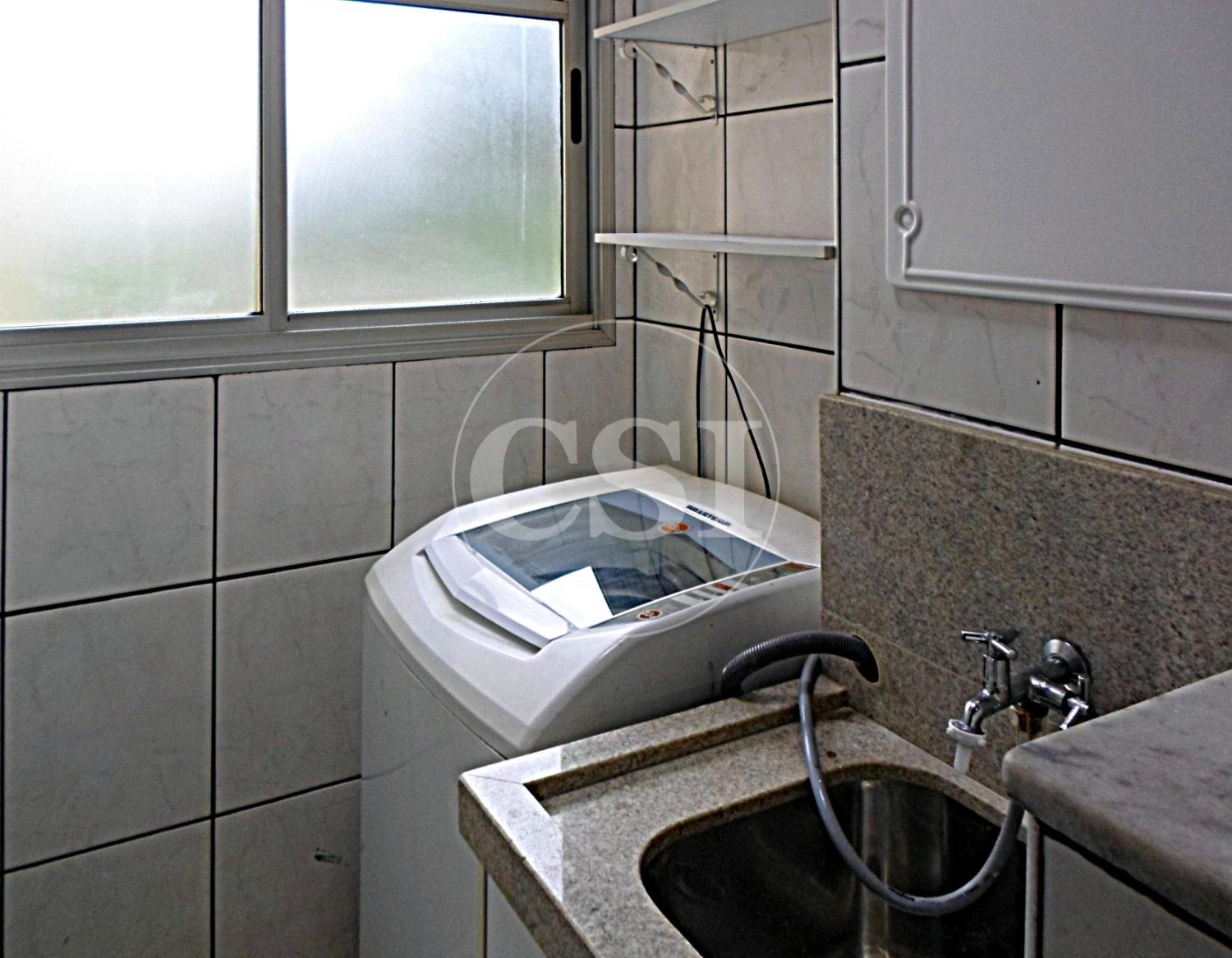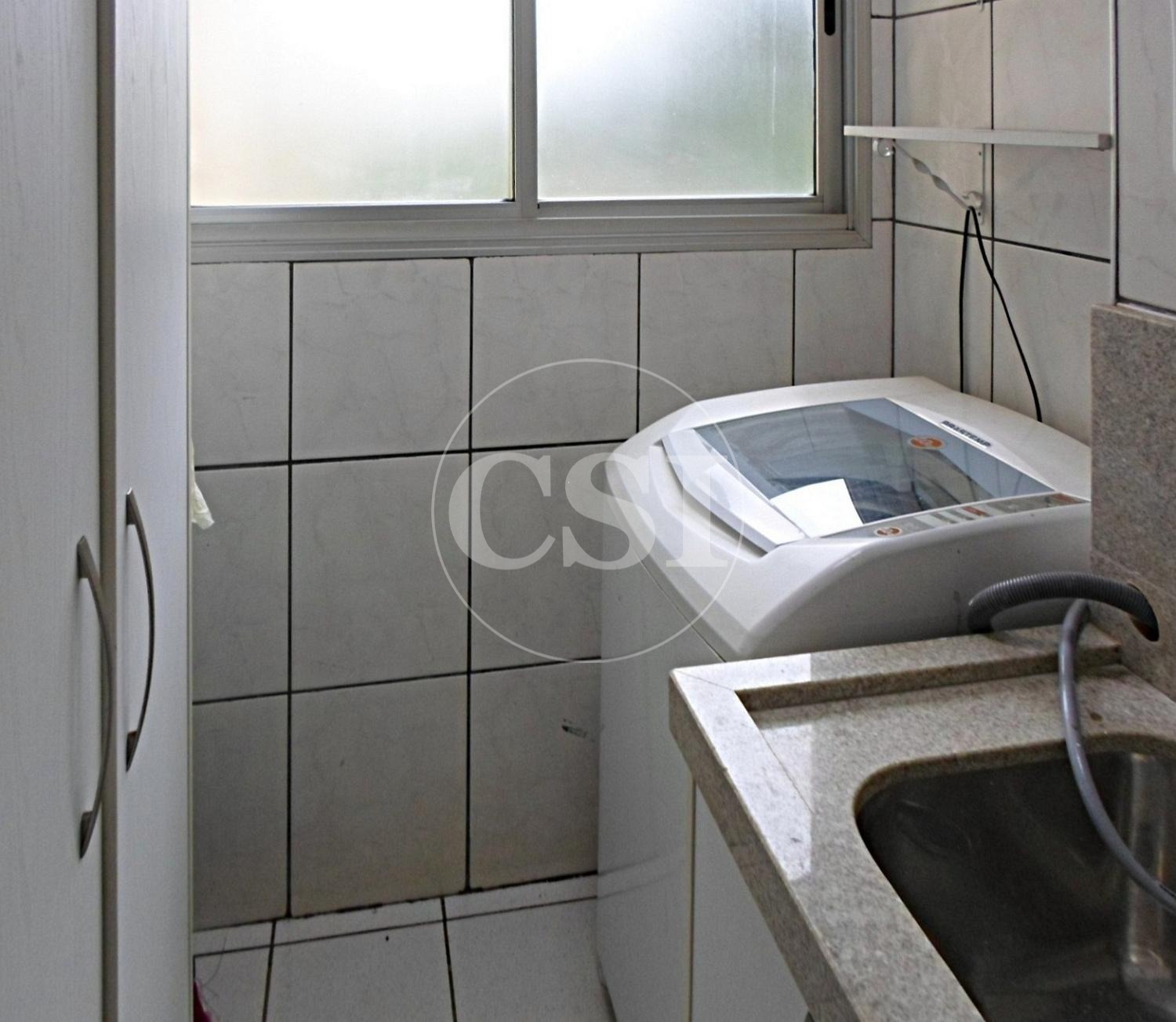 Área de serviço com armário e máquina de lavar