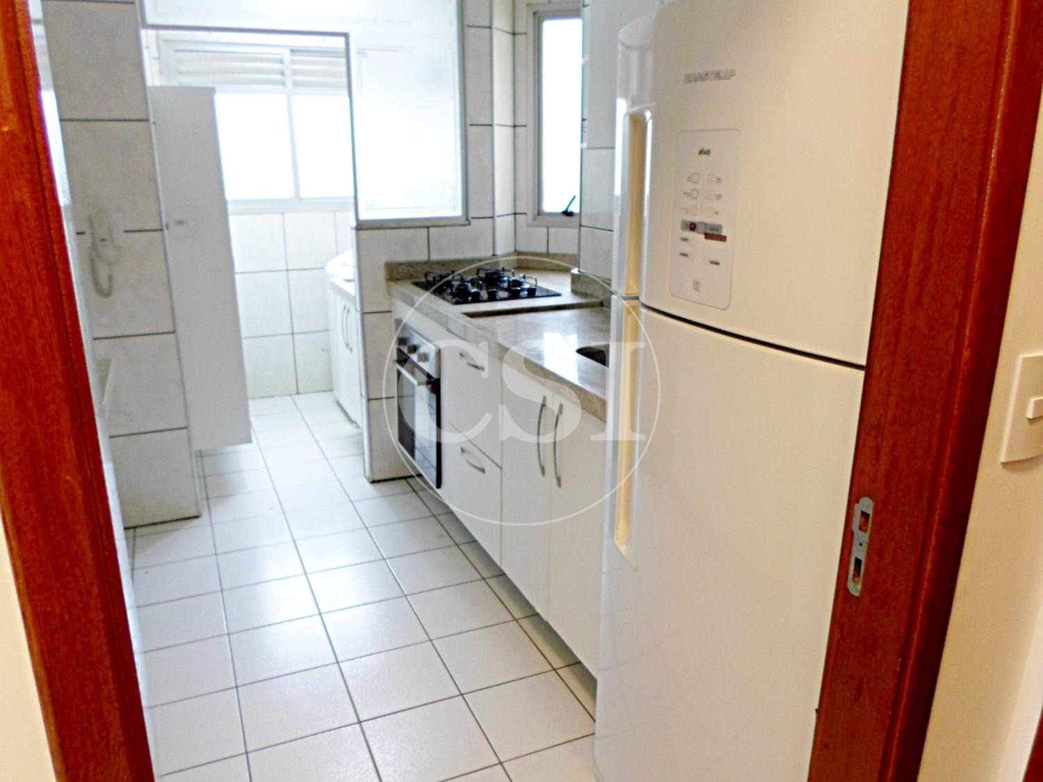Cozinha planejada equipada com cooktop, forno, geladeira, freezer e filtro de água