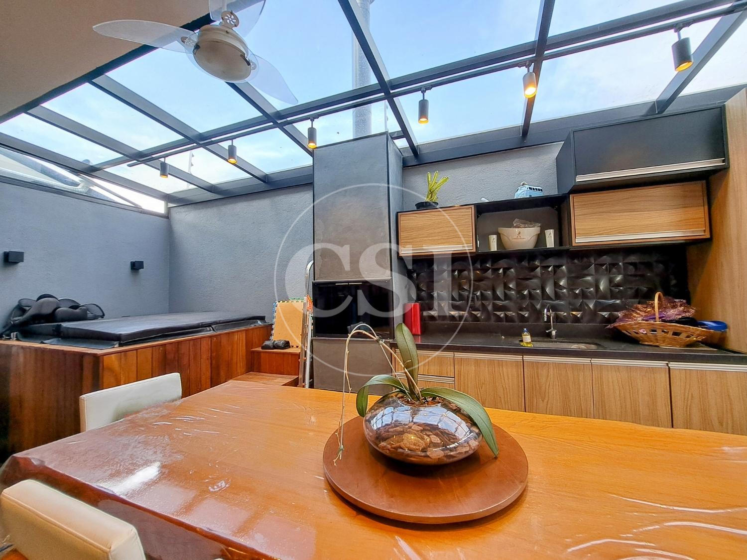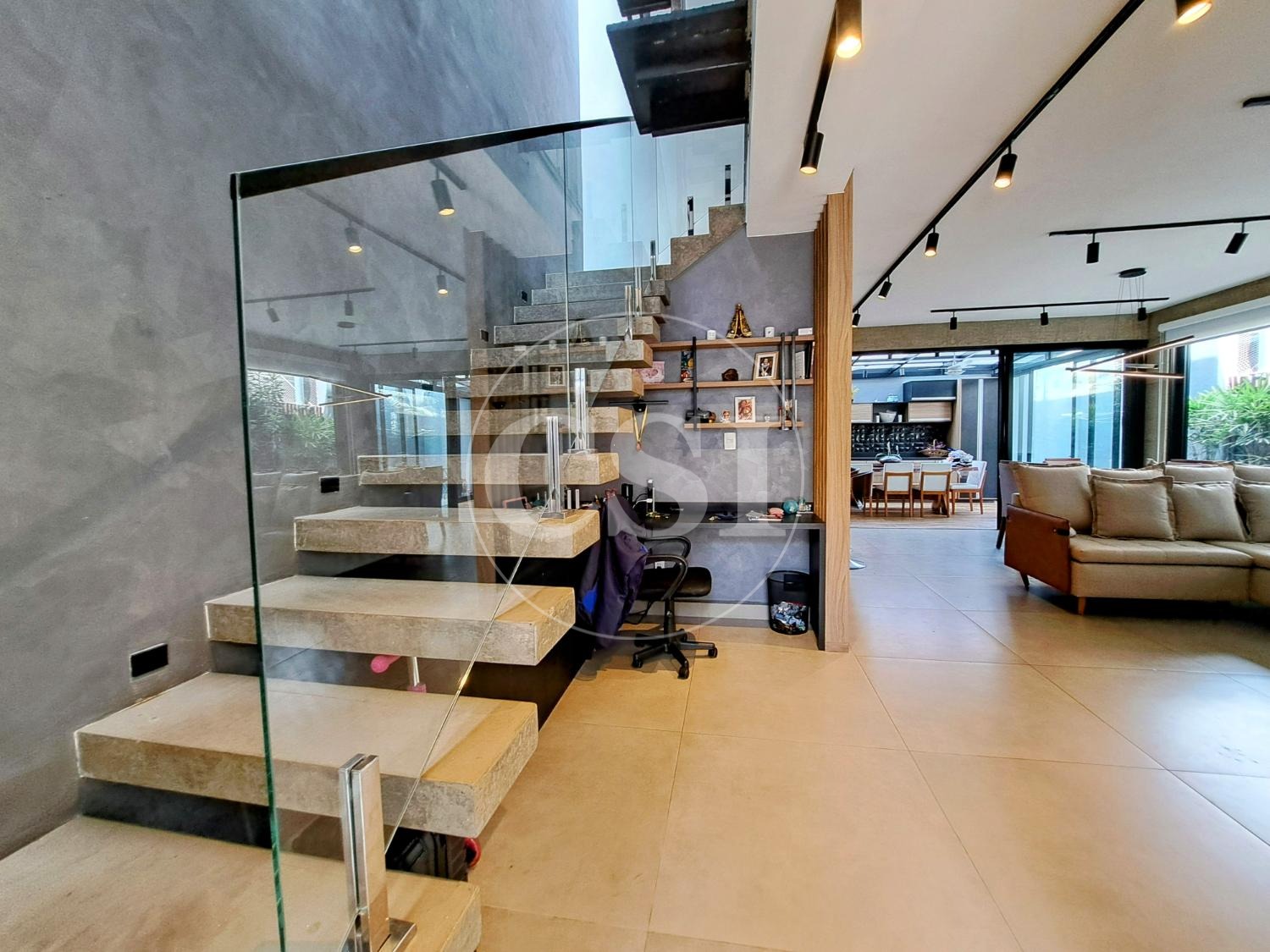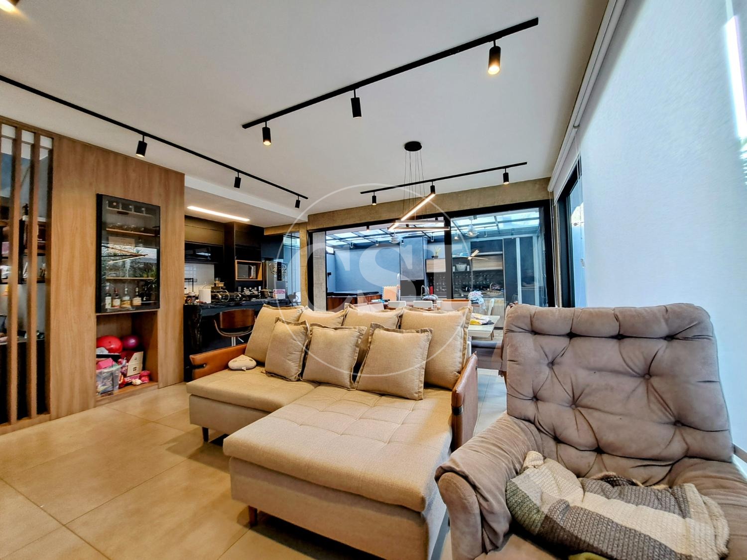 Projeto personalizado e moderno, com ampla sala para 3 ambientes, lavabo, escritório e cozinha americana bem integrada aos demais espaços. Conta com uma linda jacuzzi e um jardim com paisagismo e iluminação, integrado à área de convívio.