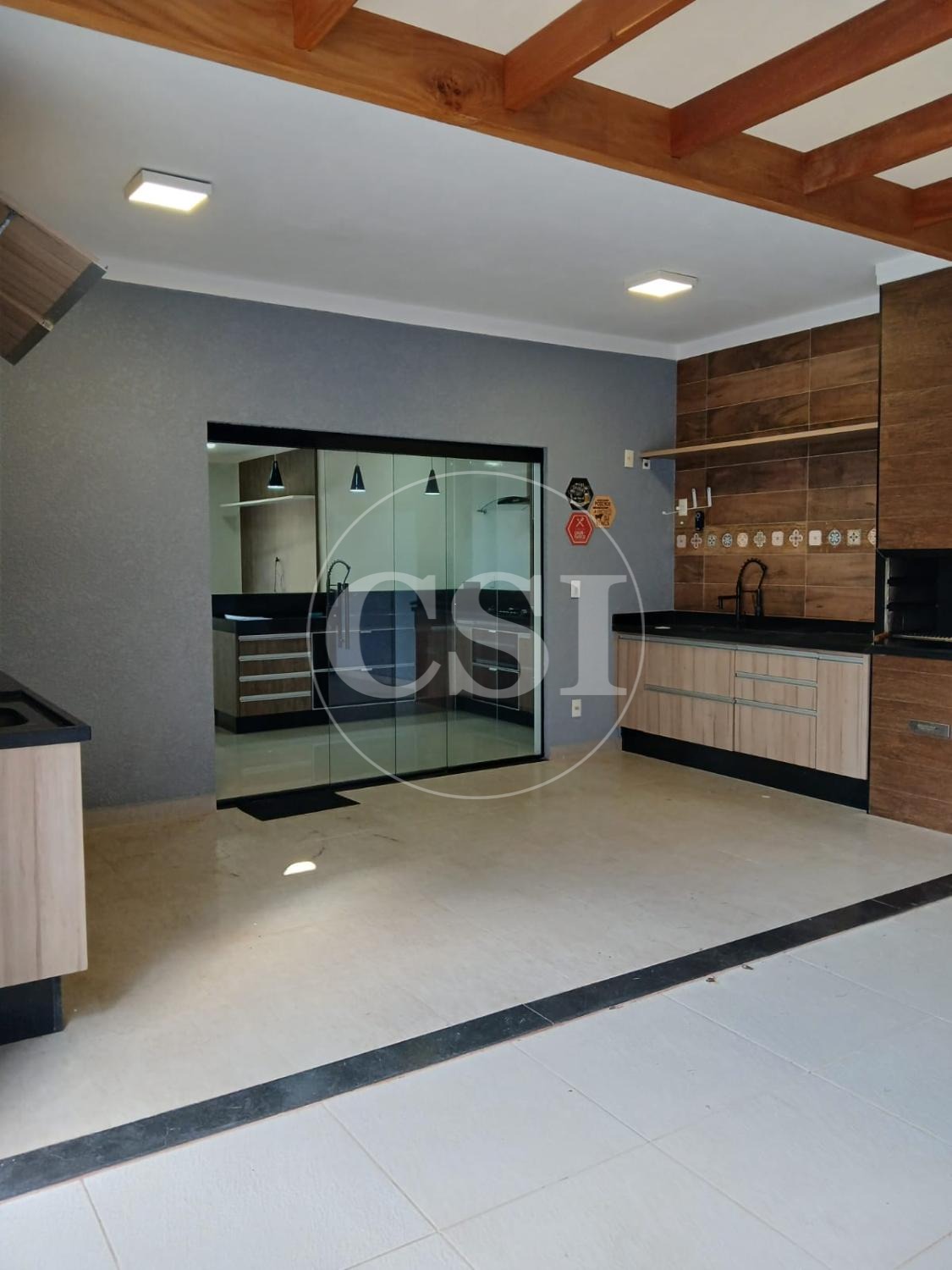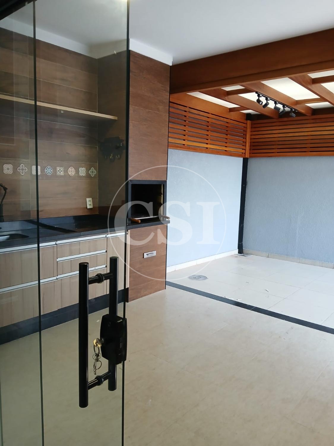 Extensão com pergolados no fundo, criando um ambiente agradável ao ar livre