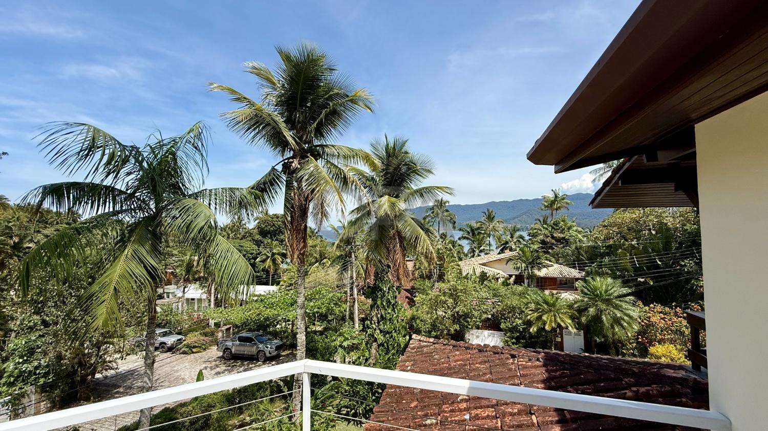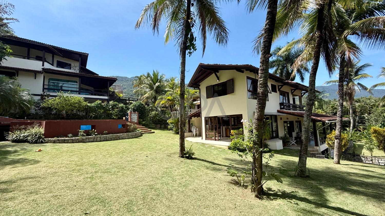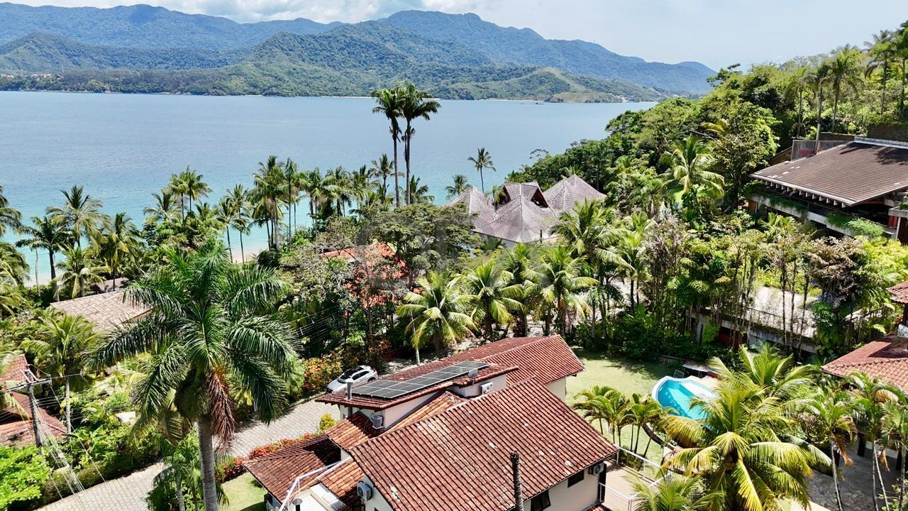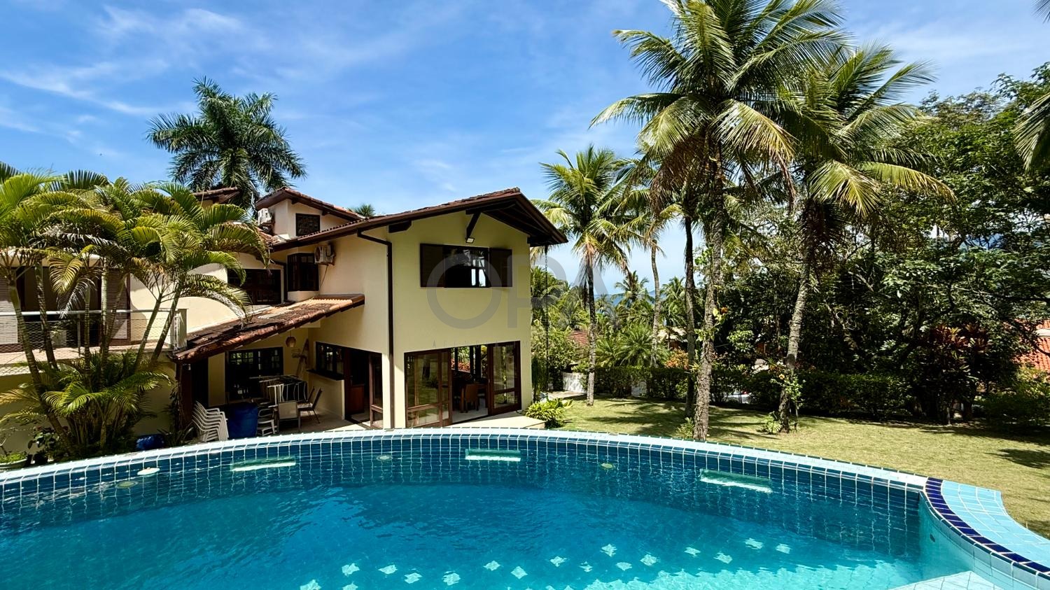 Com 980 m² de terreno e 450 m² de área construída, a casa dispõe de 5 suítes amplas, todas climatizadas, sendo que as suítes superiores contam com varandas e vista para o mar.