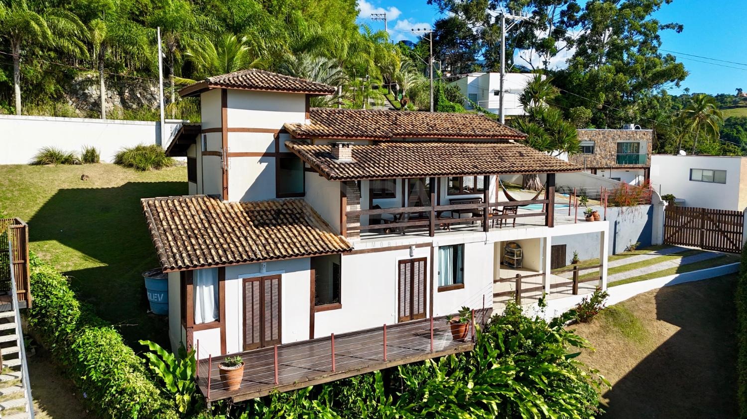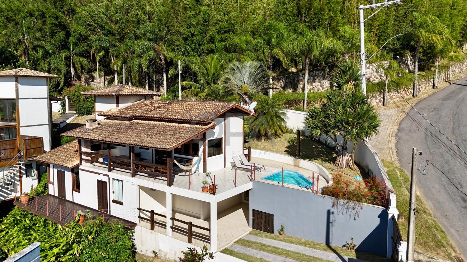 A área externa conta com piscina ensolarada e espaço para descanso, além de um jardim que complementa a atmosfera de casa de praia.